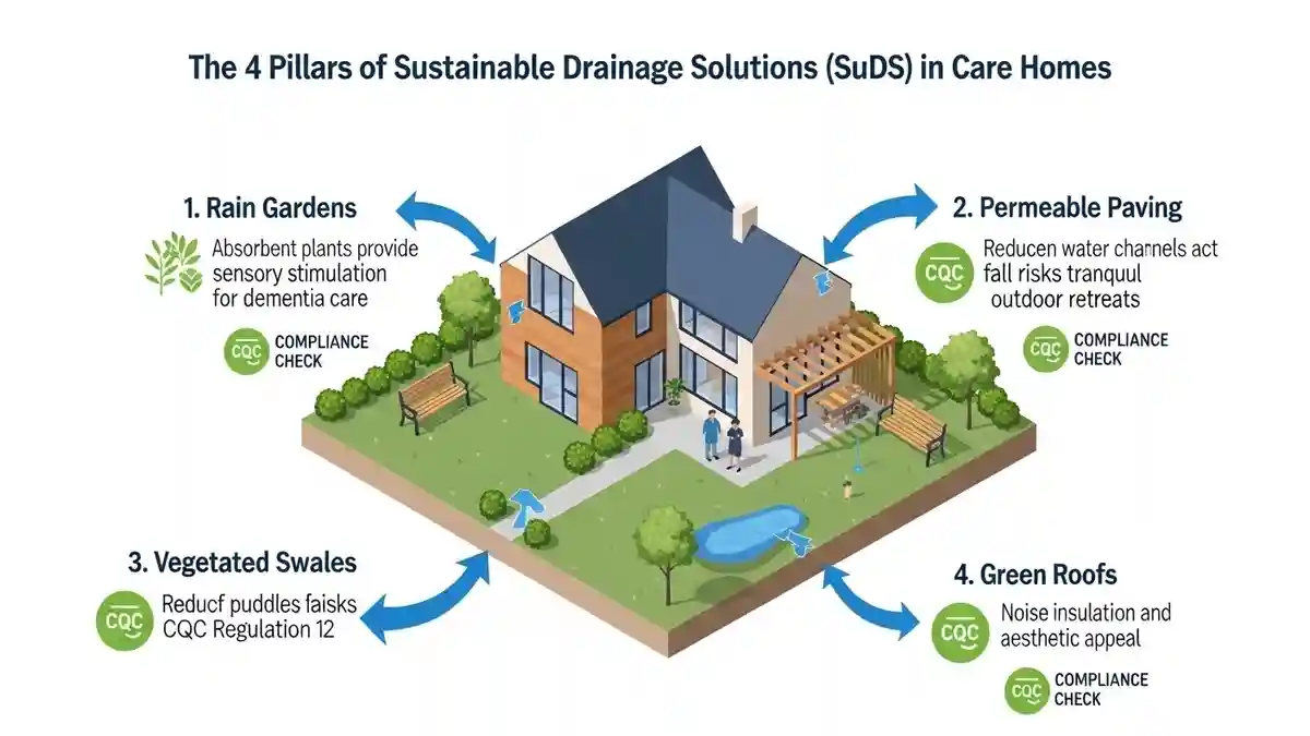 The future of sustainable drainage solutions CQC care home design is the integration of SuDS (Sustainable Drainage Systems). In Ashford, Policy EN18 of the Local Plan encourages SuDS to manage surface water runoff, which often plagues the surrounding area.